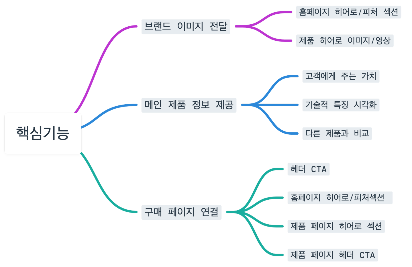 - '브랜드 이미지 전달'과 '제품 경험', '구매 페이지 연결'을 중심으로 핵심 기능 리스트업