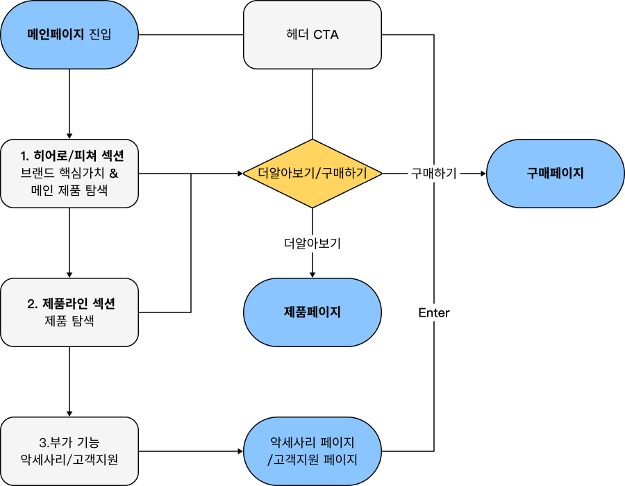 - 사용자 흐름: 홈페이지와 제품 페이지에서 핵심이 되는 사용자 흐름을 설계합니다. 예를 들어 홈 페이지의 어느 영역에서든 사용자가 '더 알아보기'나 '구매하기' 버튼을 누르면 해당 페이지로 바로 이동하도록 설계해서, 모든 사용자 행동이 제품을 탐색하고 구매로 이어질 수 있도록 유도했습니다.